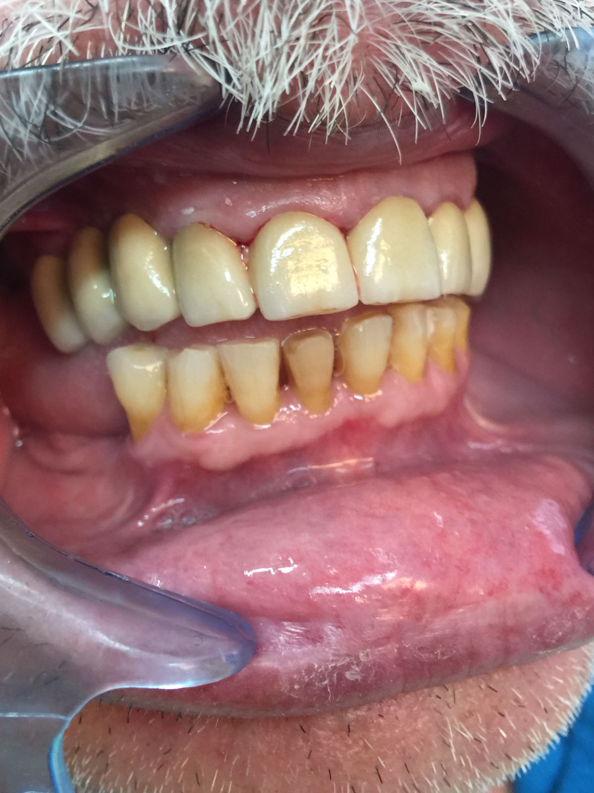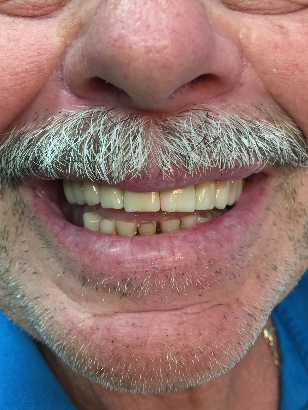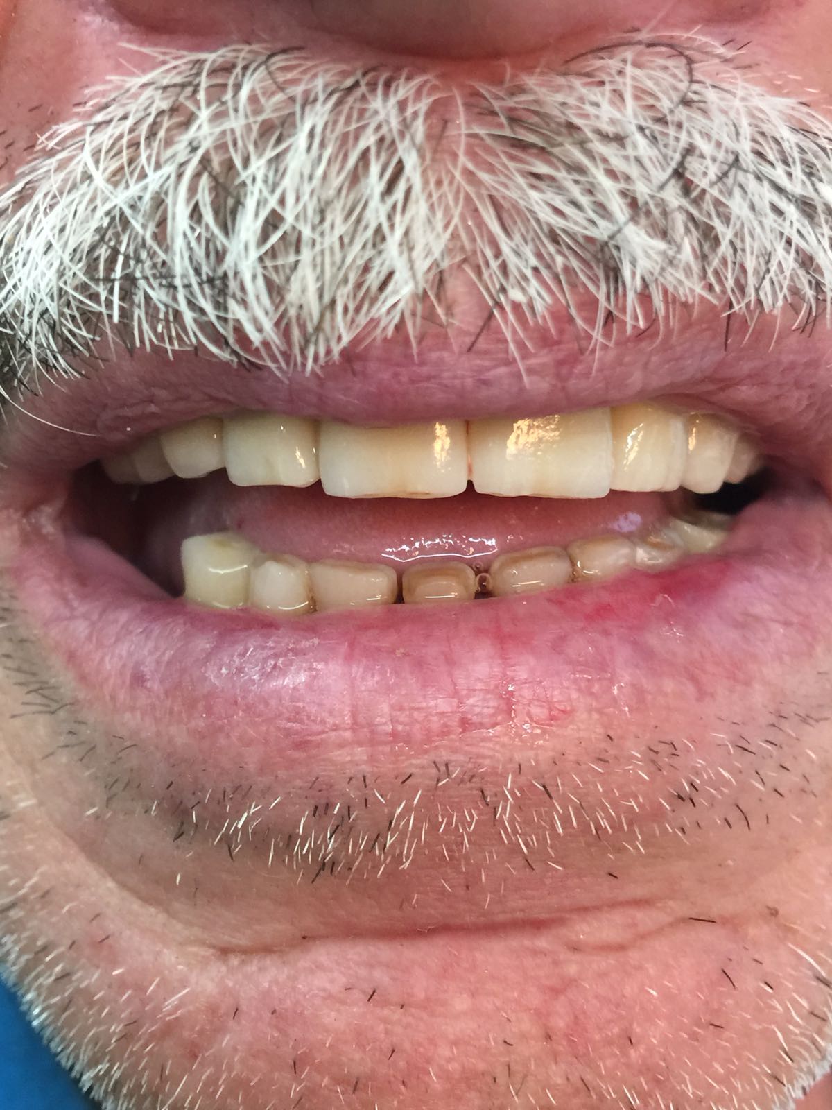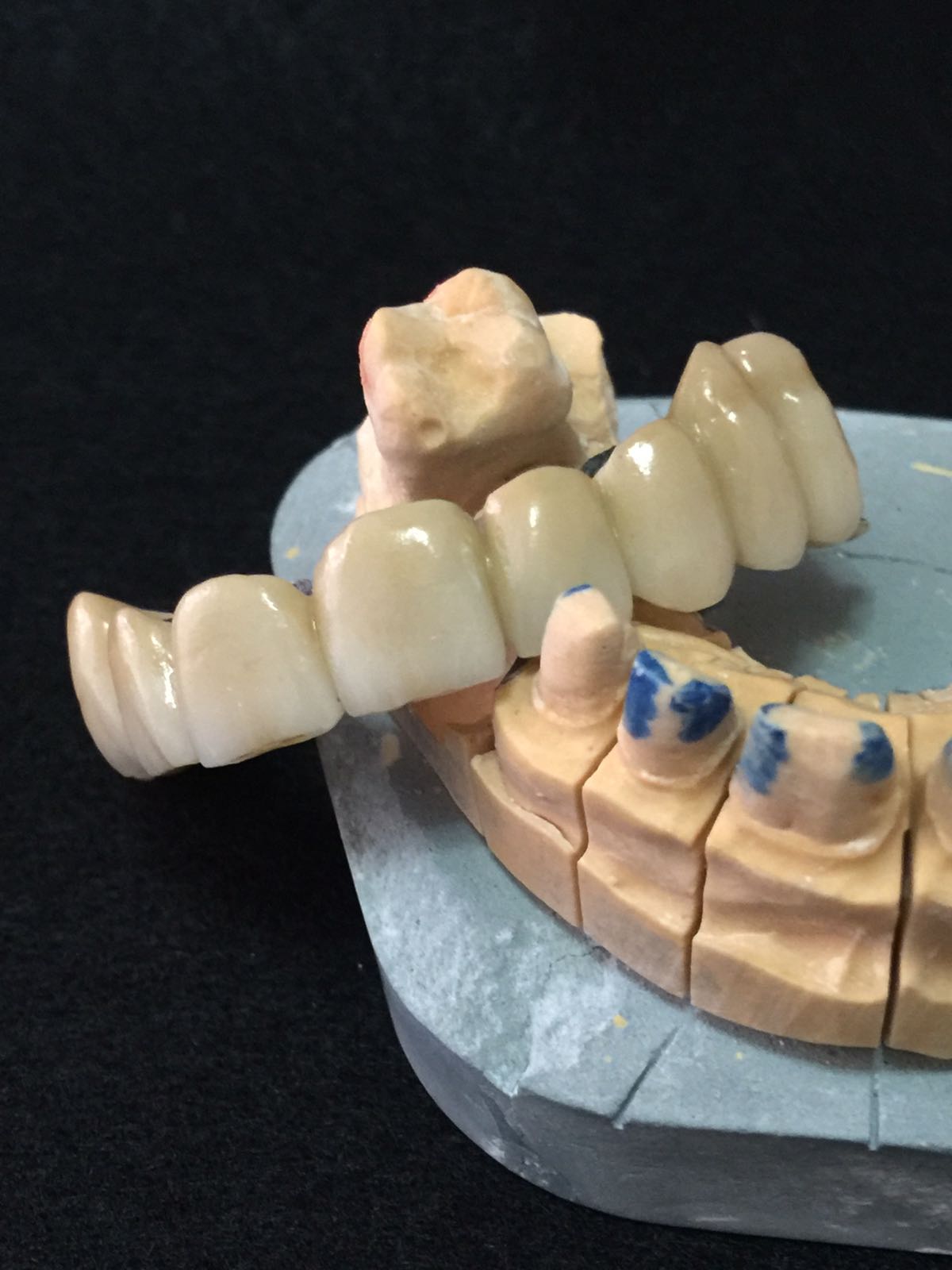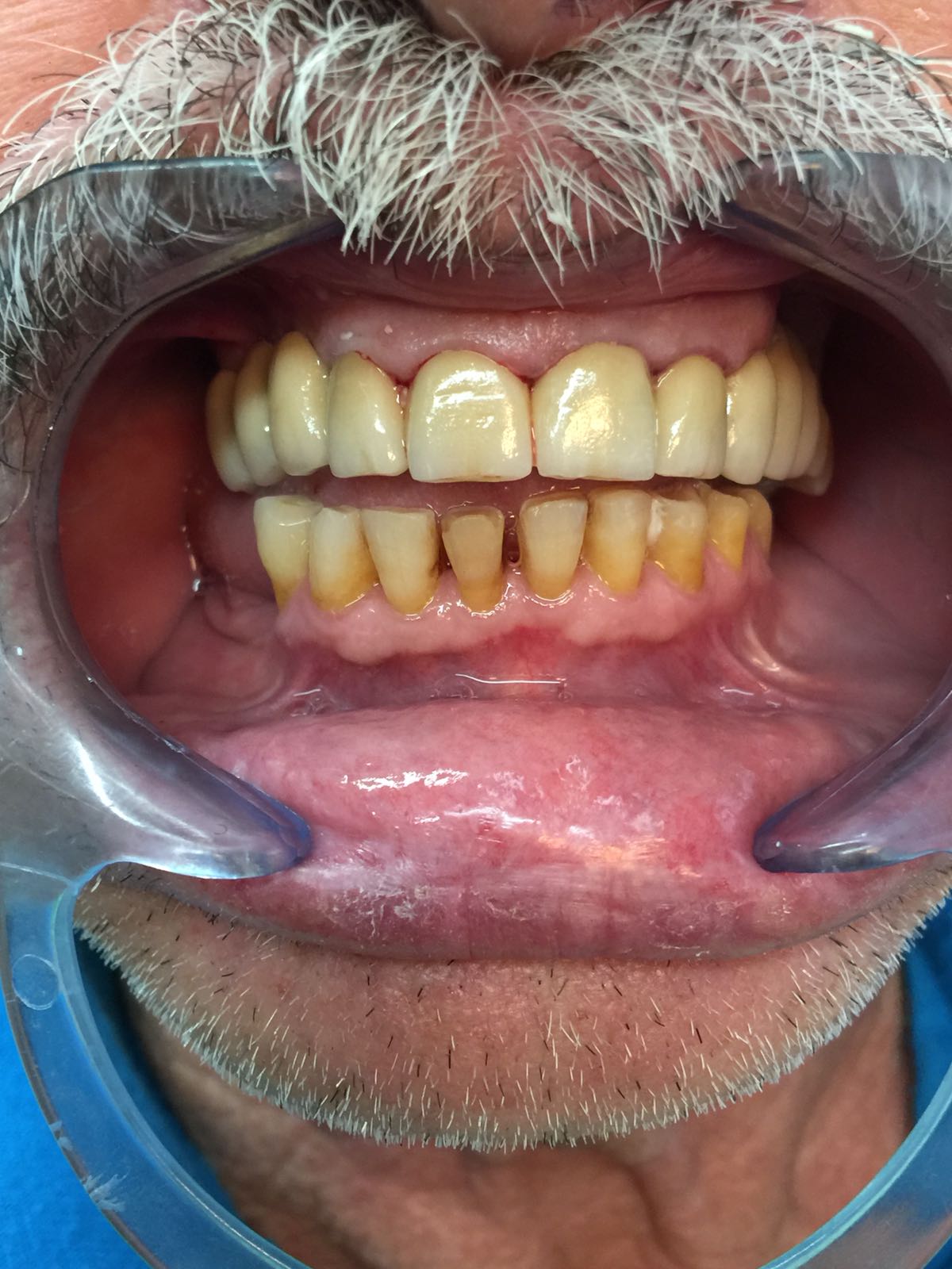 Partiendo de la preparación clínica de los muñones y elaboración del provisional clínico, hemos realizado una rehabilitación entera de 10 elementos de toda la parte superior siguiendo la anatomía y morfología desgastada de la dentición del paciente imitando la naturaleza real del mismo.